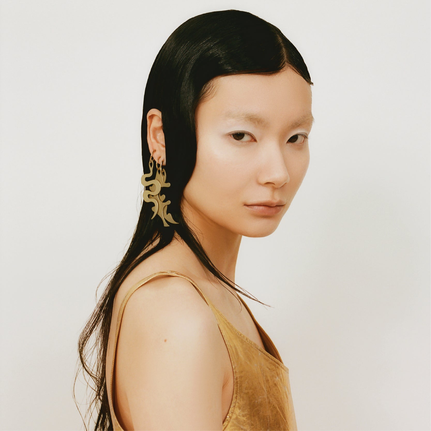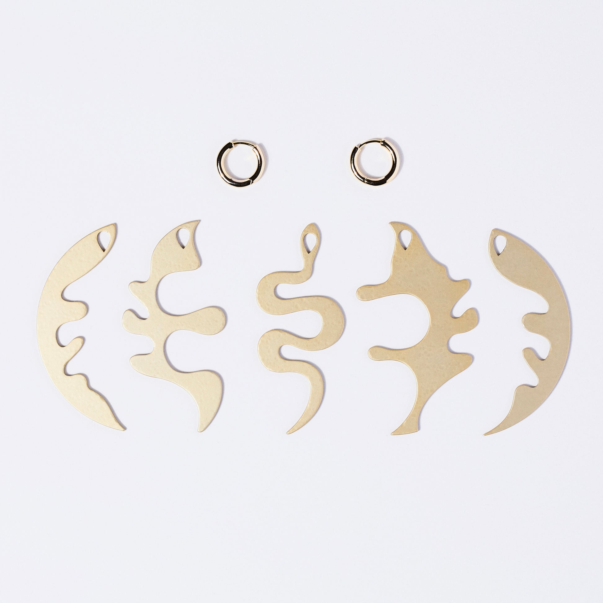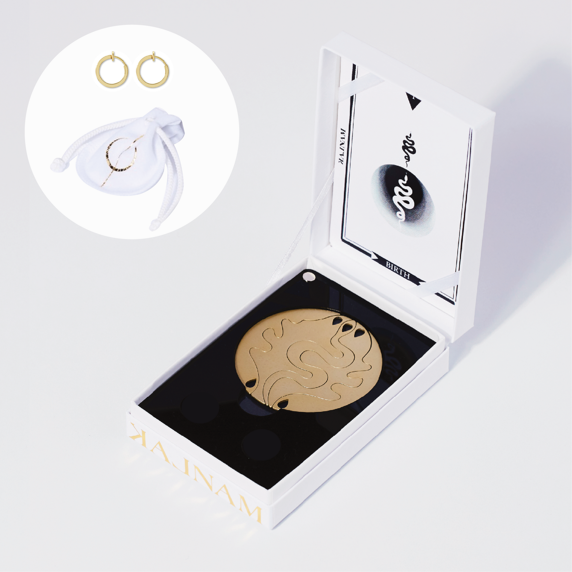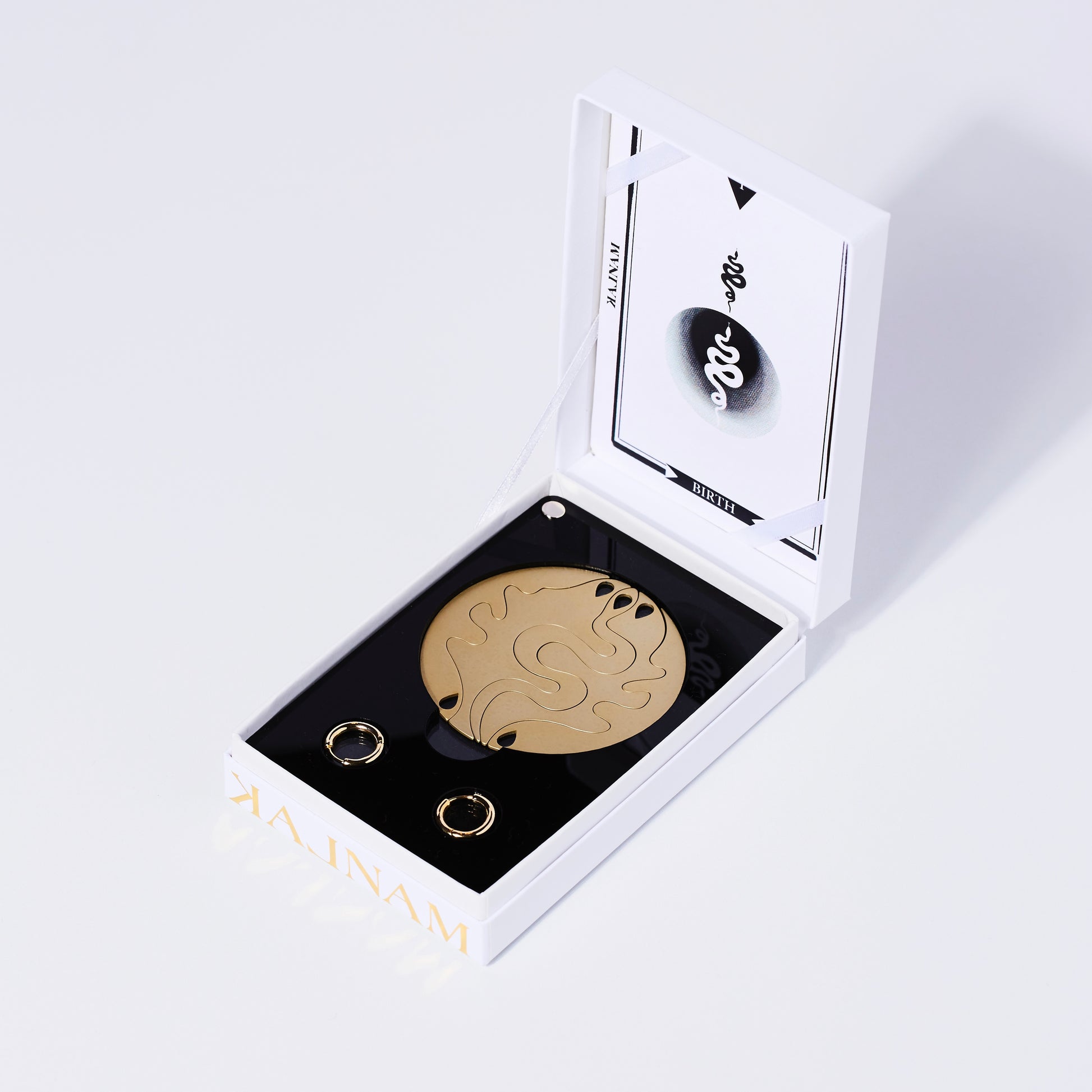 生命力の象徴である蛇が、月から生まれる姿を表現した「BIRTH」。上品なシャンパンゴールドは、闇に浮かぶ月の光をイメージしています。表面を手加工で細かく叩き、月のクレーターのような凹凸を入れました。