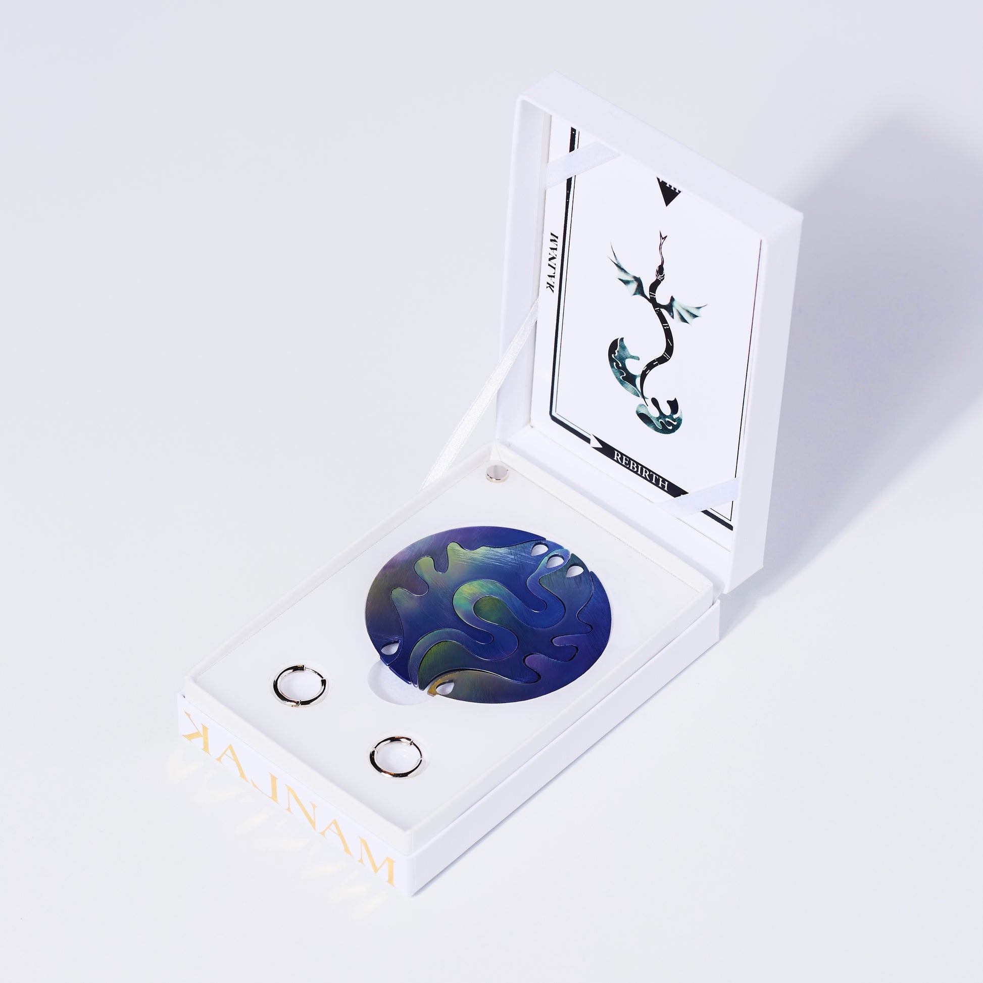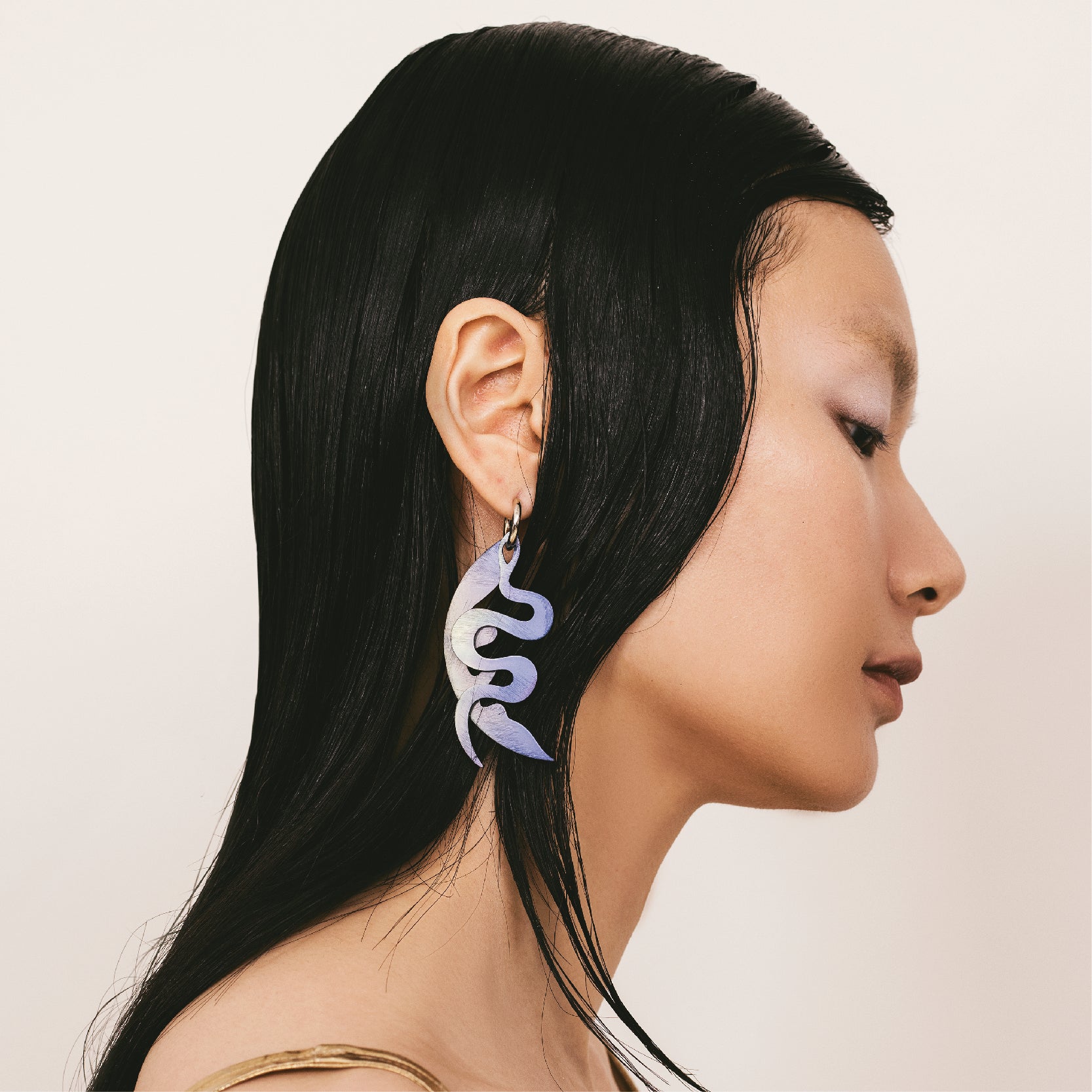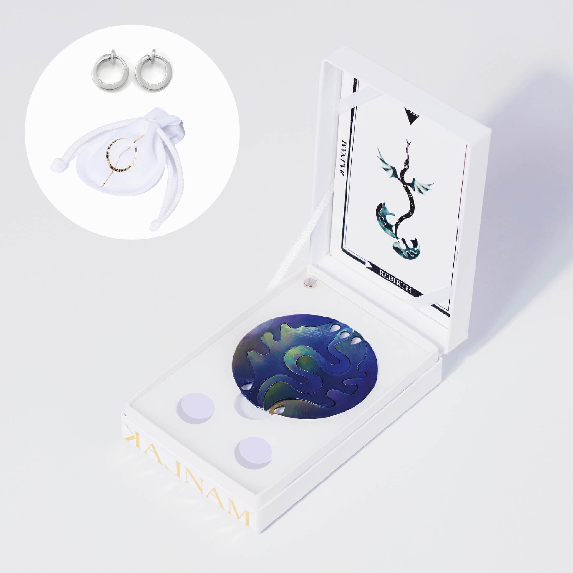 生命力の象徴である蛇が、地球に生まれる姿を表現した「Rebirth」。表面に手加工でテクスチャーを入れ、さらに一つ一つグラデーションに染め上げるという、非常に手の込んだデザインです。