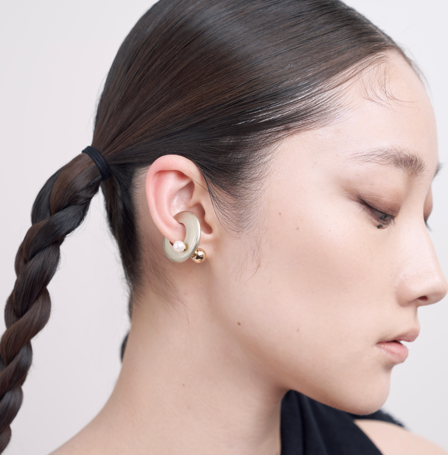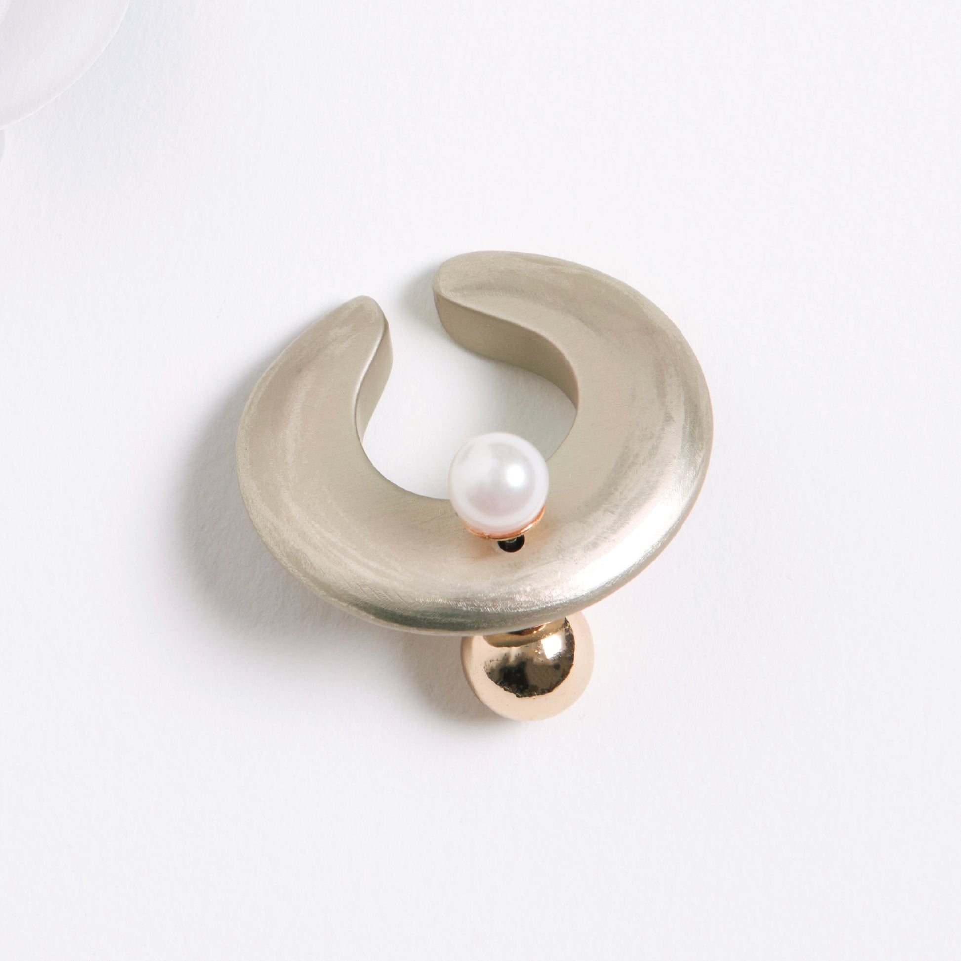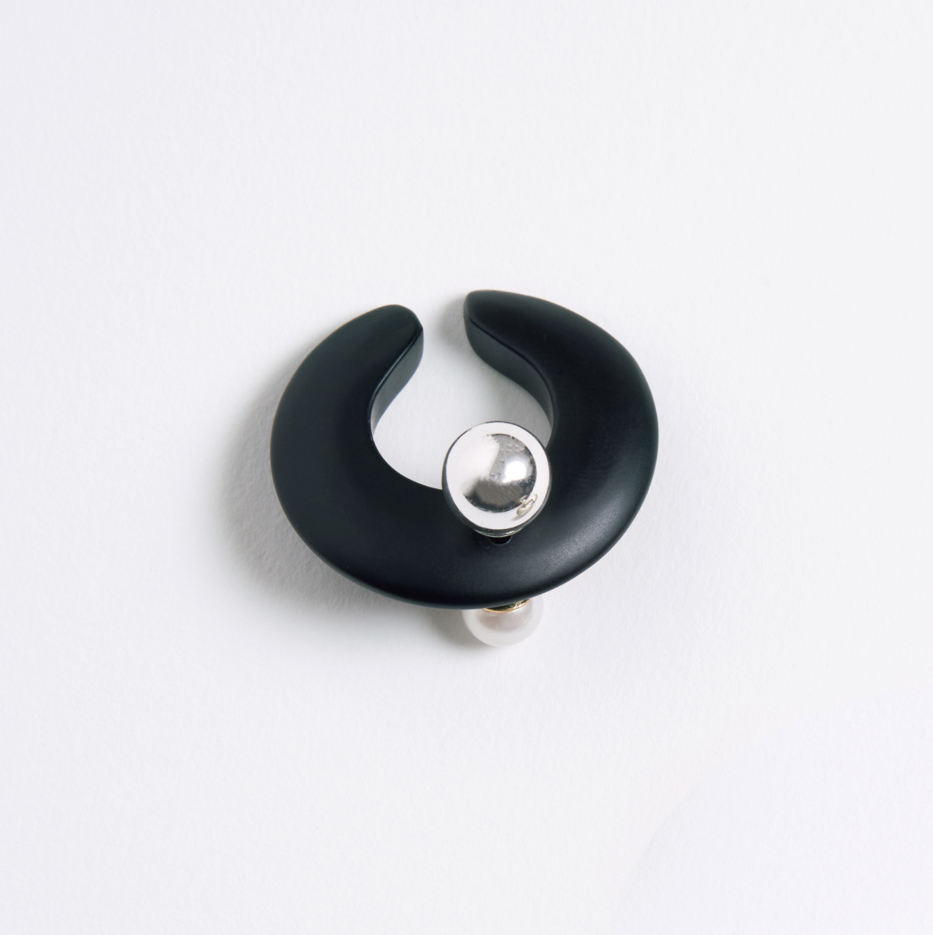 アルミニウムの塊を手作業で削り、小石のようなフォルムに仕上げたイヤカフ。本体に開いた1つのピアスホールに、パールピアスとメタルボールのキャッチが取り付けられています。購入後はピアスをお好みのものと取り替えていただくことも可能です。お手持ちのピアスとミックスして、様々なアレンジをお楽しみください。アルミニウムは非常に軽い素材のため、見た目のインパクトに反して驚くほど軽やかな付け心地となっています。また、イヤカフは落としてしまうのでは・・と心配のある方にも安心してご使用いただけるしっかりと安定したホールド感。新感覚のイヤカフをぜひ体感してください。ゴールドはコーヒーの色素で染めた自然な色味で、パールとのコンビネーションが上品。ブラックはクールな印象で、顔全体を凛々しく引き締めてくれます。